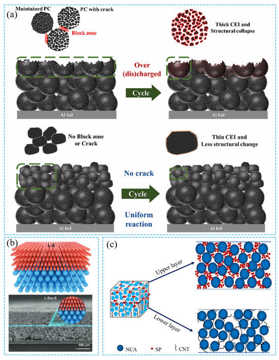 Increasing the thickness of the cathode can significantly enhance the loading of active materials. This thick cathode design effectively reduces the proportion of non-active components, such as current collectors and separators, within the battery (Figure 2a). Furthermore, this approach not only lowers the manufacturing cost of the battery but also improves its volumetric energy density. As a key technology to improve the energy density of LIBs, the design of thick cathodes faces multiple complex challenges in the manufacturing process. The heterogeneity of cathode structure is the primary problem. The non-uniform distribution of conductive additives (such as carbon black) and binder will lead to the obstruction of the electron conduction path. This inhomogeneity will aggravate the interface resistance and reduce the utilization rate of active materials especially in thick cathodes. Studies have shown that the uniformity of conductive additive and binder domain distribution can be improved by regulating the migration behavior of binders (such as optimizing drying conditions or using new binder systems), thereby improving the overall performance of the cathode []. In addition, the high load characteristics of thick cathodes can easily lead to mechanical failure. The capillary stress caused by solvent evaporation during drying can lead to coating cracking, while the plastic deformation during compaction may destroy the contact between particles. In response to these problems, researchers have proposed a variety of strategies: the introduction of water/isopropanol mixed system can reduce the capillary pressure during the drying process and inhibit crack formation []; laser drilling or 3D current collector design can alleviate the bottleneck of ion transport []. The dry cathode process significantly improves the structural integrity of the thick cathode by avoiding the solvent volatilization problem of traditional coating []. In terms of electrochemical performance optimization, single-crystal cathode materials (such as LiNi0.8Mn0.1Co0.1O2) have become an ideal choice for thick cathode design due to their excellent mechanical stability and low volume expansion characteristics []. Combined with optimized electrolyte formulations (such as those containing LiBO2 additives []), the interface side reactions can be further suppressed.