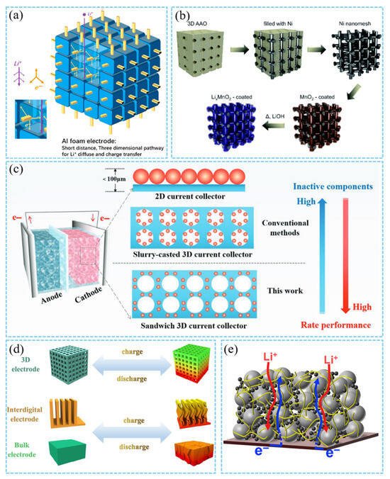 (a) The electron and lithium-ion transfer in the Al foam electrode []. Reproduced with permission from [Elsevier], [2022]. (b) Fabrication scheme of the nano-mesh cathodes []. Reproduced with permission from [Royal Society of Chemistry], [2013]. (c) Structural and performance differences in sandwich 3D current collectors and slurry-casted 3D current collectors []. Reproduced with permission from [John Wiley and Sons], [2019]. (d) Structural stabilities of the conventional bulk electrode, interdigital electrode, and 3D-printed electrode during the charging and discharging []. Reproduced with permission from [American Chemical Society], [2022]. (e) Schematic representation for electron/ion transport behavior of carbon fiber-interwoven cathodes []. Reproduced with permission from [Elsevier], [2016].