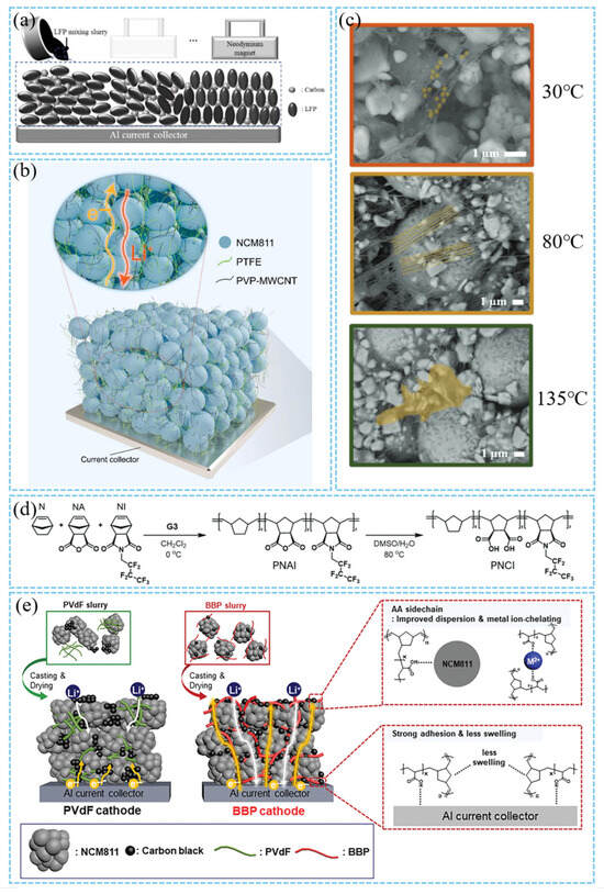 (a) Magnetic treatment schematic diagram of positive cathode slurry []. Reproduced with permission from [Springer Nature], [2022]. (b) Schematic illustration of the PVP encapsulating the surface of CNT through molecular chains []. Reproduced with permission from [John Wiley and Sons], [2025]. (c) SEM images of PTFE cathode composites after the fibrillation process at temperatures of 30 °C, 80 °C, 135 °C []. Reproduced with permission from [Royal Society of Chemistry], [2013]. (d) Synthesis of PNCI terpolymers []. Reproduced with permission from [Elsevier], [2025]. (e) Schematic representation depicting structural superiority of the BBP cathode over the PVDF cathode []. Reproduced with permission from [John Wiley and Sons], [2024].
