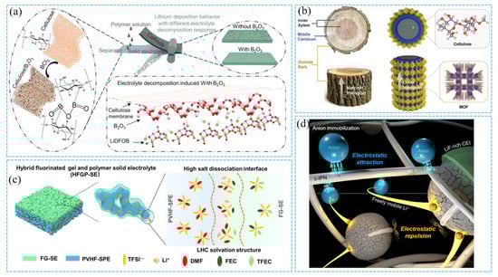 (a) Schematic illustration of Li deposition in the pouch cell assembled with cellulose/B2O3-based solid electrolyte []. Reproduced with permission from [John Wiley and Sons], [2023]. (b) The Li-MOF (metal–organic framework)/cellulose structural diagrams with the tree-trunk structure []. Reproduced with permission from [John Wiley and Sons], [2022]. (c) Designed a hybrid fluorinated gel and polymer solid electrolyte []. Reproduced with permission from [Royal Society of Chemistry], [2025]. (d) Schematic diagram of the regulation of electrostatic phenomena by cationic polymer binders [].