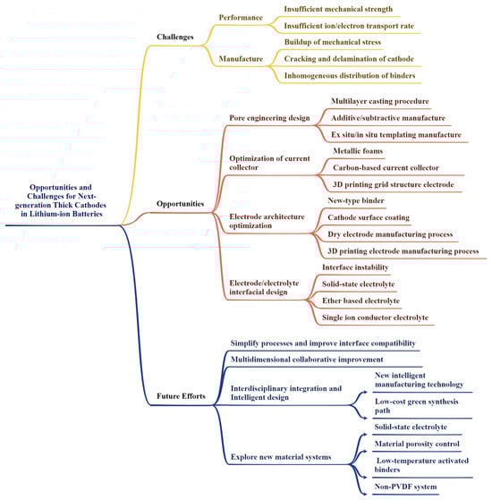 Thick cathode design is an effective approach to improve the energy density of LIBs and reduce capital by increasing the load of active materials and reducing the proportion of non-active components such as conductive agents and binders simultaneously. Although the thick cathode has great potential, its practical application still faces many challenges including performance degradation, manufacturing complexity, and the feasibility of large-scale production [,]. For example, the energy density of the nickel-rich-cathode (i.e., a commercial cathode material with high specific capacity)-based LIBs is only about 250 Wh/kg, which is far behind the energy density demand target of the automobile industry (i.e., 400~500 Wh/kg) at present []. Thus, understanding the opportunities and challenges for next-generation thick cathodes in LIBs is important.
