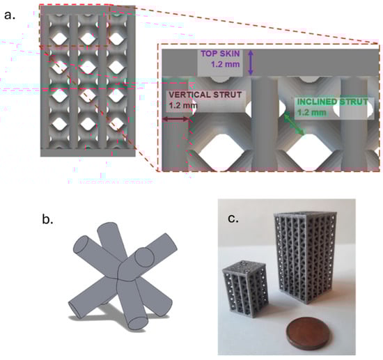 The relative density, which can also be expressed as solid material volume fraction, i.e., the ratio between the volume of the lattice and the one of the solid that encloses it, was 43%. Two different geometries were produced. The first one had three cells along the X-Y direction and five along the Z direction and was used for the process optimisation. The second one had 5 × 5 × 10 cells and was used for compressive tests (Figure 2c).