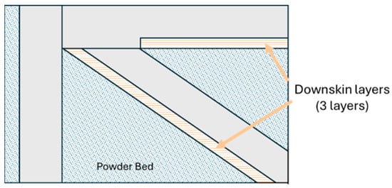 In order to identify the best parameter set that optimised both internal density and dimensional accuracy, a full-factorial design of experiments (DOE) was developed and analysed. However, some process parameters were kept as constants for all experimental sets, using the conditions established for the production of bulk Scalmalloy® samples on the same machine. In particular, the core infill laser power was set to 195 W, the layer thickness to 0.03 mm, and the scan strategy to a 67° rotation for all samples. The platform was heated to 100 °C, and samples were produced directly on the platform with a surplus of material of 0.5 mm. Samples were later cut from the substrate via electrical discharge machining, removing the material surplus and ensuring coplanarity between the skins. Particular attention was given to the power applied to the downskin layers, which are the layers directly melted on powder (Figure 3). Apart from laser power, the other parameters were not changed depending on the layers orientation.
