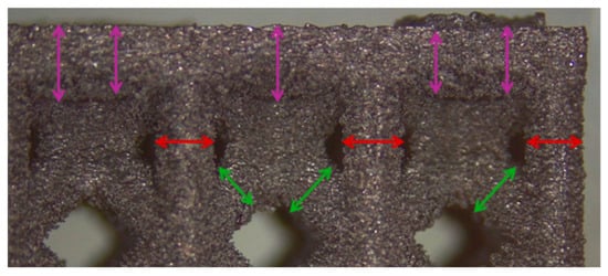 Features measured for the DOE analysis, i.e., inclined struts (green arrows), vertical struts (red arrows), and top skin (purple arrows).