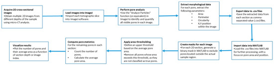 Algorithmic workflow for the analysis of micro-CT cross-sectional images: pore features are extracted in ImageJ, then processed in MATLAB through masking and area-based thresholding, leading to the quantification of pore count and average area per section.
