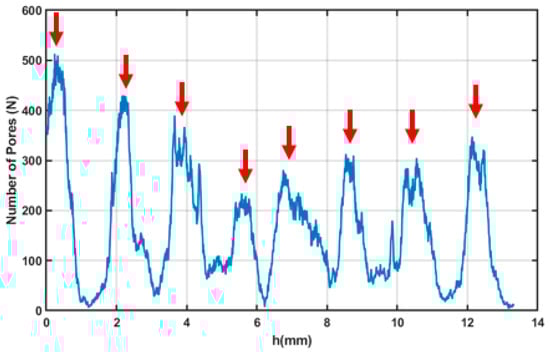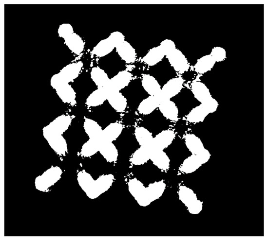 Furthermore, on the optimised sample, micro-computed tomography (micro-CT) was performed in order to observe porosity distribution. In typical micro-CT systems, an X-ray source emits a cone beam that passes through the sample, with attenuation depending on the material’s density and composition. The acquired projection data are then reconstructed using filtered back-projection or iterative algorithms to generate detailed 3D representations. The micro-CT analysis reported in this manuscript was performed using a Bruker Skyscan 1273 (Billerica, MA, USA), employing two scanning protocols to optimise spatial resolution and contrast. Samples were scanned using an X-ray beam generated at 110 kV and 232 μA, filtered with a 0.5 mm Al filter, and with an exposure time of 270 ms. The transmitted radiation was captured by a digital detector (Varex 2315-S/N 55251, Varex Imagening, Walluf, Germany) with a pixel size of 80 μm, positioned at a relative distance of 121 mm from the X-ray source. This setup produced a series of two-dimensional radiographic projections. During scanning, the sample was rotated on a motorized stage through 360°, in steps of 0.15°, allowing projection data to be acquired at multiple angles. A total of 1666 2D scans were acquired at vertical intervals of 8 μm, covering the entire sample height. These projections were then computationally reconstructed into virtual cross-sections at various depths, ultimately yielding a high-resolution 3D model of the sample with a final spatial resolution of 8 μm. The porosity analysis (Figure 5) was performed by initially processing X-ray images using ImageJ software.