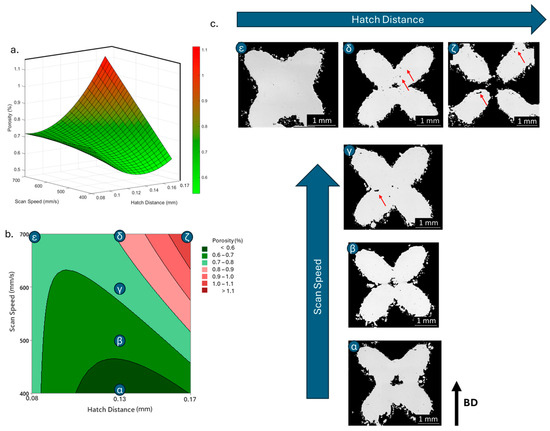 Porosity response to scan speed and hatch distance in 3D (a) and contour (b) plot; (c) images of density of defined samples with porosities highlighted by red arrows.
