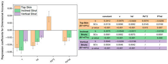 Regression coefficients for the dimensional accuracy response model, with standard error ER, p-value and also model coefficient of determination: top skin (orange), inclined struts (green), vertical struts (purple).