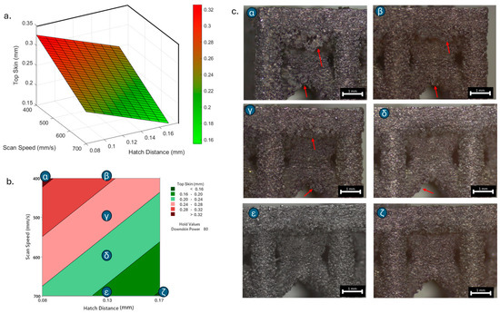 Top skin response to scan speed and hatch distance at constant downskin power of 80 W in 3D (a) and contour (b) plot; (c) images of defined samples with surface defects highlighted by red arrows.