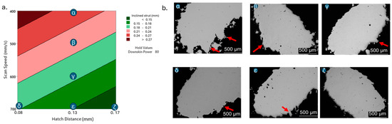 Inclined strut response to scan speed and hatch distance at constant downskin power of 80 W in contour plot (a); (b) images of defined samples with surface defects highlighted by red arrows.