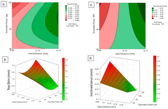 Top skin response to downskin power and hatch distance at constant scan speed of 700 mm/s in 3D (a) and contour (b) plot; inclined strut response to downskin power and hatch distance at constant scan speed of 700 mm/s in 3D (c) and contour (d) plot.