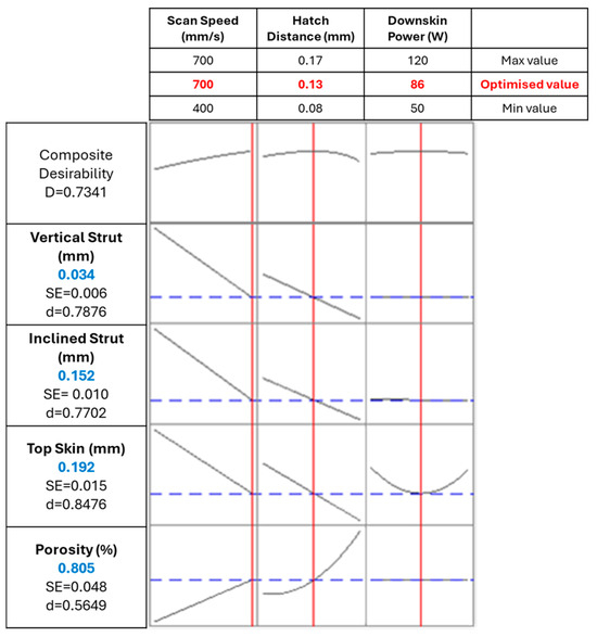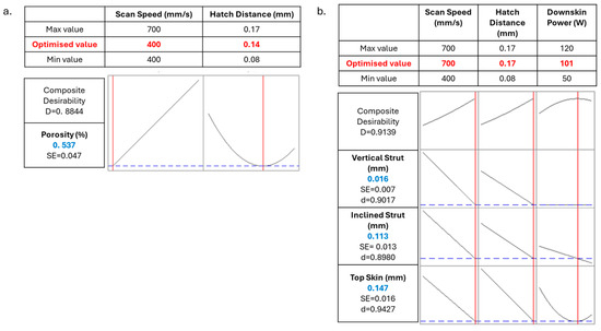 Similarly, the parameter set that optimised the dimensional accuracy was identified by the model, with a scan speed of 700 mm/s, hatch distance of 0.17 mm, and downskin power of 101 W. The predicted results reported in Figure 14b are compared with measurements from samples produced at the same scan speed and hatch distance as the prediction but with downskin powers of 80 or 120 W. It can be observed that the predicted values lie within the experimental ranges for both samples, which exhibited an inclined strut deviation of 0.116 ± 0.061 mm and 0.083 ± 0.060 mm and a top skin deviation of 0.142 ± 0.110 mm and 0.175 ± 0.086 mm for 80 W and 120 W, respectively. In general, the sample produced with 80 W downskin power showed mean values in closer agreement with the predicted values, i.e., 0.113 mm for the inclined strut and 0.147 mm for the top skin. However, the vertical strut data show larger discrepancies between predicted and experimental values. Although the predicted value of 0.016 mm falls within the experimental standard deviation range, it differs notably from the measured values of −0.006 ± 0.043 mm and −0.003 ± 0.037 mm for 80 W and 120 W, respectively, which also show significantly high standard deviation. This discrepancy is attributed to the high variability in the measured vertical strut data, which leads to larger uncertainty in these measurements, as already observed for vertical struts.