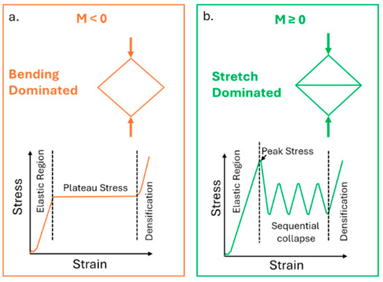 The final mechanical properties of lattice structures depend on different aspects, as explained by Ashby and Gibson. In his “The properties of foams and lattices” [5], containing discussions that are further expanded in [14,15], Ashby explained that the lattice mechanical behaviour is not only influenced by the material from which the lattice is made and responsible for the intrinsic properties of the solid material, but it is also influenced by the design used for its cells. Although initially developed for foams, the laws discussed by Ashby and Gibson have been extended to trabecular structures and have been frequently applied to describe the compressive behaviour of lattice structures produced by AM technologies [4,16,17]. In particular, great influence has been attributed to the cell topology and shape and to the relative density, which is the ratio of the density of the cellular structure to the density of the solid material [16,18]. The cell design greatly influences the dominating behaviour during the compressive tests. Struts can indeed be seen as Euler–Bernoulli beams, and they can tend to bend or to stretch depending on the constraints in the cell [4]. Furthermore, the mechanical properties, in particular the compressive stress and the static modulus, have been reported to show a positive power relationship with the relative density, allowing mechanical behaviour predictions through the Ashby–Gibson model, where the nature of this relationship depends on the dominant behaviour [5,19].