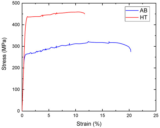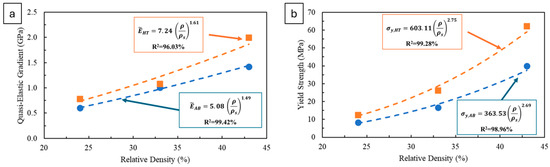 To measure the material yield strength and elastic modulus required for verifying the Ashby–Gibson model, tensile tests were conducted in both conditions, AB and HT, in accordance with ASTM E8. Flat specimens were built horizontally, meaning the longitudinal axis was parallel to the building platform. The tests were carried out at room temperature, with a preload of 3 MPa and a test speed of 0.008 1/s, and were repeated three times.