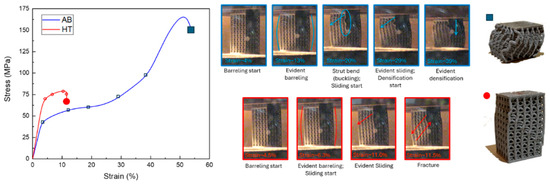 Following ISO 13314-2011 [53], compressive specimens with struts of 1.2 mm were tested at compression at room temperature, with a testing speed of 1 mm/min. The samples employed for the tests consisted of lattices with 5 × 5 × 10 cells, resulting in an overall size of 21 × 21 × 41 mm3. They were tested in both the as-built condition (AB) and the heat-treated one (HT), employing a heat treatment at 325 °C for 4 h as typical for Scalmalloy® [30]. At least two samples per type were tested.