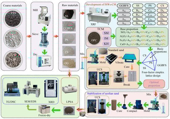 (6) The ISWs-CM developed to stabilize aeolian sand were employed, and a comparative analysis of the phase composition and microstructure was conducted between aeolian sand stabilized with the ISWs-CM developed in this study (ASISW), the ISWs-CM developed in a previous study [44], and the OPC (ASOPC) reported on in the literature to elucidate the fundamental mechanism enabling the developed ISW-CM to serve as a viable substitute for OPC. The methodological framework of this study is shown in Figure 1.