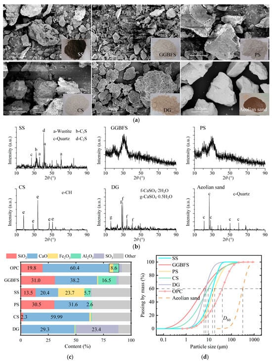 (1) Based on the primary oxide composition (CaO, SiO2, Fe2O3, Al2O3) of OPC, four types of ISWs prevalent in China with substantial stockpile volumes were selected as the primary constituents for the ISW-based CM: SS, GGBFS, PS, and CS. These ISWs possess oxide compositions analogous to OPC and exhibit mutually complementary and adjustable proportions. Specifically, SS, GGBFS, and PS were utilized to provide hydraulically active minerals such as C2S and C3S for hydration reactions in appropriate proportions, while CS was employed to regulate the alkalinity of the system. Additionally, DG was incorporated to enhance the compactness of the system.