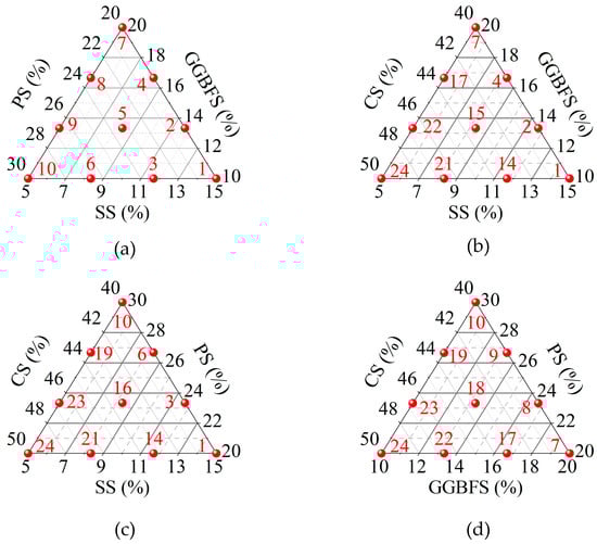 Primary lattices of simplex lattice design: (a) CS = 40%; (b) PS = 10%; (c) GGBFS = 20%; (d) SS = 5%.