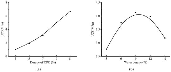 Variation in UCS of ASOPC with cement and water dosages: (a) OPC dosage and (b) water dosage.