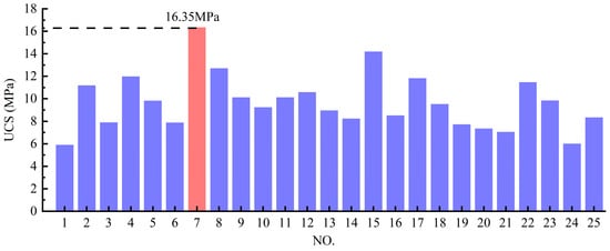 Three repeated experiments were performed for each proportion to minimize error, and UCS was taken as the average of the three specimens.