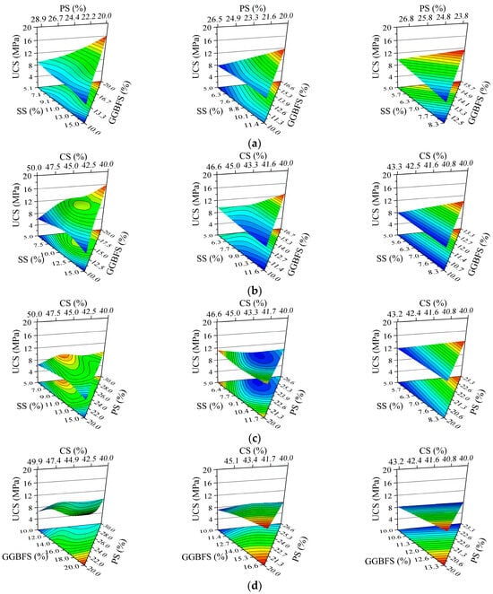 SS serves as the fixed factor in Figure 6d. The UCS of the mortar increases with an increase in GGBFS and decreases with an increase in PS, regardless of the SS dosage. Meanwhile, when CS is increased, the UCS of mortar with an SS dosage not exceeding 8.3% initially rises and then falls but is almost unaffected by CS when the SS dosage is increased to 11.6%. This can be explained by the restricted variation range of CS due to the elevated proportion of SS, as well as the insensitivity to changes in the alkalinity of SS caused by its low hydration reactivity.