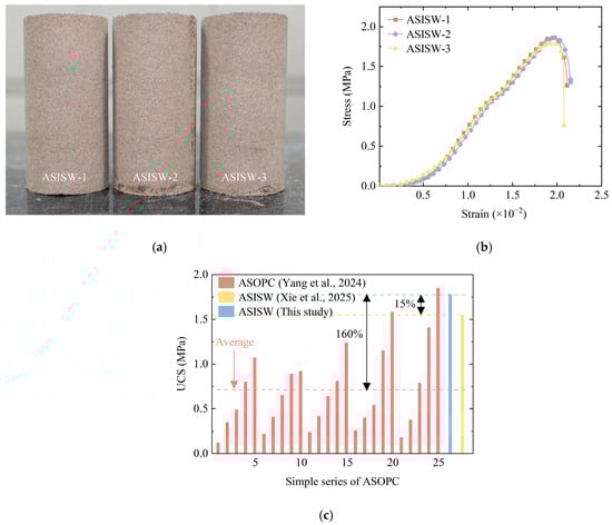 The ASISW specimens are shown in Figure 7a, where specimen identification numbers for the three parallel tests are labeled. Figure 7b presents the stress–strain curves obtained from UCS tests on these specimens. The curves exhibit three distinct phases: Phase 1, the compaction stage with a progressively increasing slope, during which inter-particle pores gradually close, and particles undergo rearrangement until the maximum density is achieved and stiffness is enhanced; Phase 2, characterized by a stable slope after the completion of pore closure; and Phase 3, where particle-to-particle bonds fracture under compressive stress, initiating and propagating micro-cracks that cause curve descent and specimen failure. The peak stress on the curve corresponds to the specimen’s UCS.