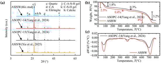 Phase analysis results of ASISW and ASOPC: (a) XRD pattern, (b) TG curve, and (c) DTG curve [44,49].