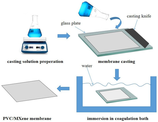 The non-induced phase inversion (NIPS) method was then used to create the neat and MXene-modified membranes as shown in Figure 1. To get rid of any remaining moisture, the PVC polymer was first dried. The membrane casting solution was made by dissolving a certain amount of PVC (14 weight percent) in 86 weight percent DMAC solvent while stirring continuously at 50 °C. After that, the mixture was then combined with various amounts of MXene, as shown in Table 1. To ensure total dissolution and homogeneity, the mixture was ultrasonically agitated for one hour and then stirred overnight. This technique is well known for dissolving agglomerates and promoting uniform nanosheet distribution in a polymer matrix. High-energy waves are introduced during sonication, which aids in the disintegration of particles and guarantees their uniform suspension in the PVC solution [28].