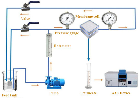 At 23 ± 1 °C, the membranes’ permeation flux and separation performance efficiency for Pb metal ions were assessed using a specially made cross-flow filtering apparatus (see Figure 2). The membrane’s surface area was 18 cm2. The water flux was calculated using the following equation [31]: