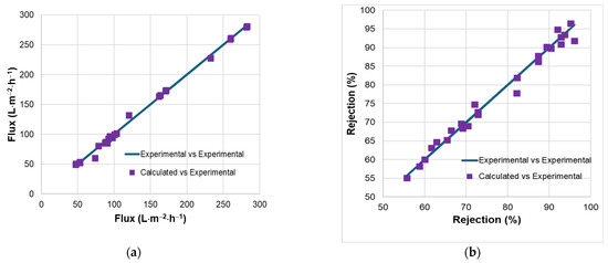 Parity plots for experimental and calculated values of flux (a) and rejection (b).