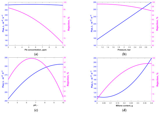 where the flux is denoted by F (L·m–2·h–1), A represents the concentration of Pb in the feed (ppm), B represents the pressure in bars, C represents the level of pH, D is the quantity of MXene in (g), and R (%) the rejection percentage.