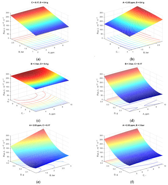 Influence of variables on the flux (two variables were kept at the values resulting from the optimization): (a) constant pH and additive content; (b) constant Pb concentration and additive content; (c) constant pressure and additive loading; (d) constant pressure and pH; (e) constant Pb concentration and pH; (f) constant Pb concentration and pressure.