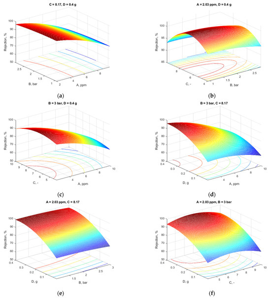 In Figure 6f is depicted the effect of two factors, MXene content and pH, at a constant Pb concentration of 2.09 ppm and a pressure of 3 bar. As can be observed from the figure, the increase in MXene content led to an increase in rejection, while the variance of MXene content had a very high, significant effect on rejection.