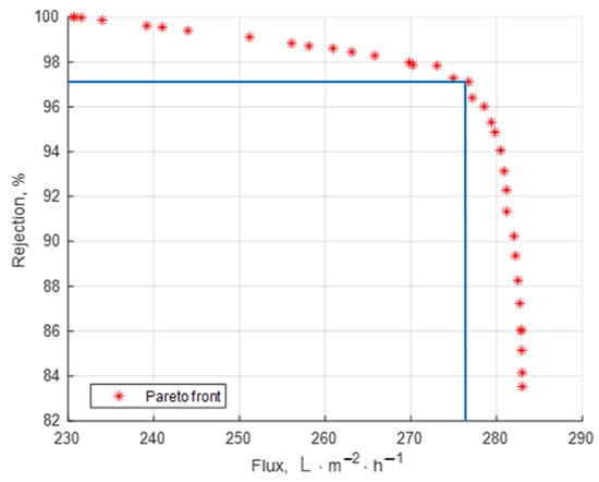 If the flux is the highest priority, the selected solution on the front should correspond to a high value of the flux, accepting a reasonable reduction in the rejection coefficient (solution in line 2 of Table 6).