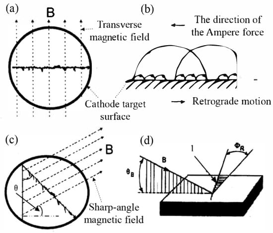 When applying a radial magnetic field to the cathode target surface, the cathode arc spot will move in the direction opposite to the Ampère force, as shown in Figure 1a, and its motion speed shows a parabolic variation with the transverse magnetic field strength (Figure 1b), and this characteristic can effectively enhance the motion speed of the arc spot [56,57,58]. If an angle θ appears between the magnetic field and the cathode surface, i.e., forming an acute magnetic field with a magnetic induction intensity of B, the cathode arc spot will not only move in the opposite direction but also exhibit the Robson drift phenomenon (Figure 1c) [59,60]. According to the acute angle principle, the drift direction points to the acute angle region θB between the magnetic field lines and the cathode target surface. In Figure 1d, the angle ΦR between the motion direction of the arc spot and the intersection line of the magnetic field lines with the target surface is approximately equal to θB. Using the acute angle principle, the magnetic field can constrain the trajectory of the arc spot and precisely control its position on the target surface. This is of key significance designing and tailoring the magnetic field configurations that optimize the trajectory of the arc spot and ensure uniform target etching [61].