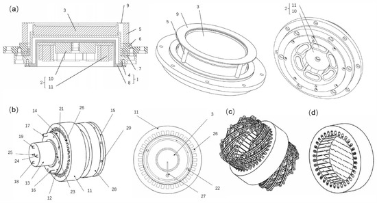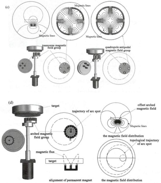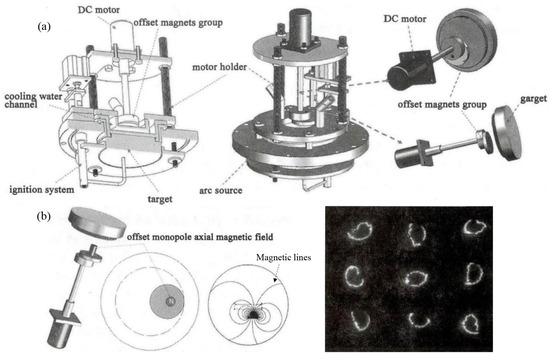 Considering the randomness of arc motion in traditional arc deposition, permanent magnets are used to generate an arch-shaped magnetic field. This design guides the arc to move along a preset trajectory, allowing circular motion on the cathode surface. Although this design achieves preliminary control of arc motion to some extent, it also has obvious limitations. Since the magnetic field configuration generated by permanent magnets is fixed, the motion area of the arc spot is restricted, resulting in low target utilization. Additionally, the high temperature in the arc spot motion area not only affects the quality of the deposited coatings but also may cause local overheating and uneven erosion of the target. To overcome the limitations of traditional permanent magnet magnetic fields, permanent magnet rotating magnetic field arc sources have been designed [69,70]. This type of arc source introduces a rotatable magnetic field that can adjust the motion area of the arc spot dynamically. This dynamic adjustment capability enables the magnetic field to be optimized in real-time as needed, improving the uniformity and the controllability of arc motion significantly, as shown in Figure 2a.