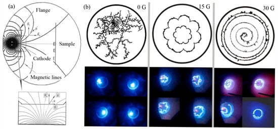 The rotating transverse magnetic field alters the trajectory and the distribution of the charged macroparticles, affecting the spatial charge layer density, thereby changing the motion state and discharge pattern of the arc spot. Specifically, the dynamic nature of the rotating magnetic field allows the arc spot to move more uniformly and orderly on the target surface, avoiding excessive concentration of the arc spot in localized areas, which reduces the generation of macroparticles. Moreover, the adjustability of the strength and the frequency of the rotating magnetic field enables a precise control over the trajectory and the speed of the arc spot, further enhancing the quality and the uniformity of the deposited coatings [51,71,75,76,77].