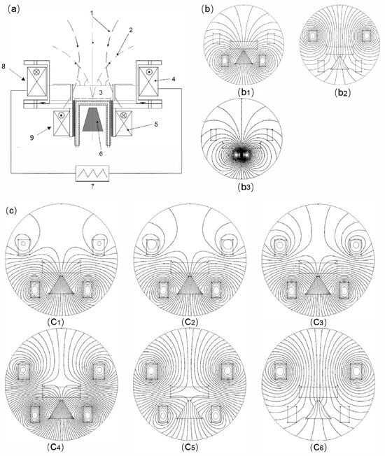 Schematic diagram of the multi-mode alternating coupled arc source and magnetic field configurations: (a) Schematic diagram of the efficient dynamic coupled magnetic field arc source device formed by the superposition of a static axially symmetric divergent magnetic field and a reverse dynamic focusing guiding magnetic field. 1. Focusing guiding magnetic field; 2. Axially symmetric divergent magnetic field; 3. Small-diameter cylindrical target; 4. Focusing guiding electromagnetic coil; 5. Axially symmetric electromagnetic coil; 6. Magnetic yoke; 7. Variable frequency power supply; 8. Focusing guiding magnetic field generation device; 9. Axially symmetric divergent magnetic field generation device; (b) Schematic diagram of different magnetic field configurations on the target surface: (b1) Axially symmetric divergent magnetic field pointing towards the edge of the target; (b2) Axial focusing guiding magnetic field pointing towards the center of the target; (b3) Axially symmetric arch-shaped magnetic field; (c) Schematic diagram of the variation in coupled magnetic field lines due to an increase in the strength of the reverse focusing guiding magnetic field while the axially symmetric divergent magnetic field strength remains constant: (C1–C6) correspond to the gradual increase in the strength of the reverse focusing guiding magnetic field.