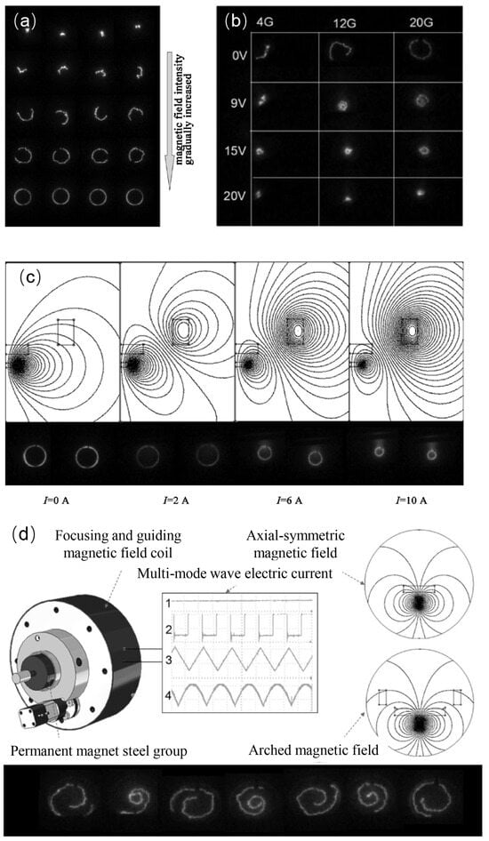The magnetic field configuration designs shown in Figure 9b–d involve coupling an axial focusing guiding magnetic field generation device to a bipolar radial rotating magnetic field generation device. The axial focusing guiding magnetic field generation device consists of an electromagnetic coil wound with enameled wire, with insulation protection inside and outside the coil. It is placed at the front end of the bipolar radial rotating magnetic field generation device and connected to a ring-shaped iron core yoke at the bottom. The coil is powered by direct current, and the strength of the focusing guiding magnetic field is adjusted by varying the current. This axial focusing guiding magnetic field changes the distribution of the magnetic field in the transport space, increases the axial magnetic field strength in the transport space, reduces the plasma constraint on the target surface, and improves the efficiency and density of plasma transport to the transport space [99].
