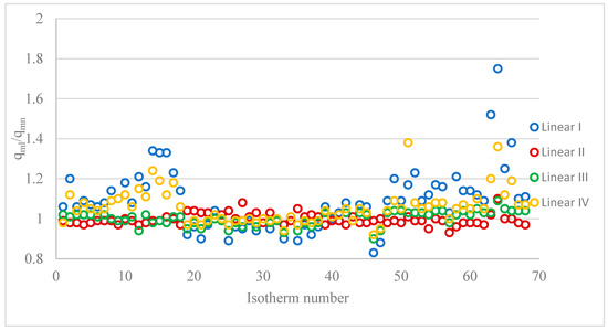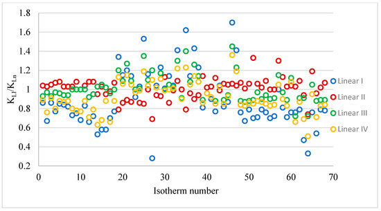 Table 3 also shows the number of isotherms for which the obtained qm values from the linear equations are less than, equal to, or greater than the constants determined from the non-linear forms (qml/qmn < 1; qml/qmn = 1; qml/qmn > 1). Figure 1 shows the qml/qmn values obtained (based on the data presented in Tables S1–S11). It was found that it was not possible to determine unambiguously that the obtained qm values from the linear form would be greater or less than those obtained from the non-linear form. When qm was calculated from the II linear form, in 40 cases (58.8%), qm values higher than those calculated from the non-linear form were obtained, and in 19 cases (28.0%), the obtained qm values were lower. When the other non-linear forms of the Langmuir isotherm were used, most of the qm values were lower than the values obtained from the non-linear form.