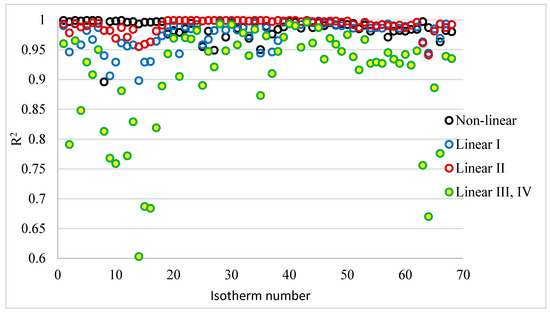 The coefficient of determination R2 is used to assess the fit of models to the test results obtained. It is usually the only statistical tool used for evaluating models of i.i.d. isotherms. In the supplement, the calculated Langmuir isotherms (non-linear and linear forms) with R2 coefficients of determination are shown in Tables S1–S11. For linear forms III and IV, the coefficients of determination are the same. This is because form III is a plot of the dependence of q on q/Ce, and form IV is the dependence of q/Ce on q. Detailed values of the coefficient of determination are presented in Figure 3.