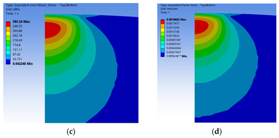 According to the geometrical and numerical calculations of the discretized model, the equivalent stress and equivalent strain distributions of the two types of asperities under the same normal displacement show significant differences. Firstly, the distribution characteristics of the stress and strain in the elastic phase are analyzed as follows (Figure 3a–d):