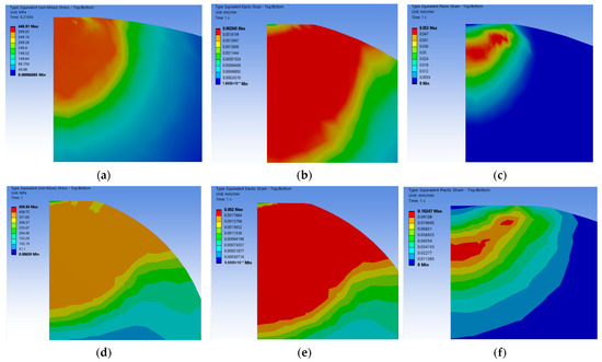 Equivalent stress and strain nephogram in elastoplastic phase . (a) Wavy equivalent stress; (b) wavy equivalent elastic strain; (c) wavy equivalent plastic strain; (d) spherical equivalent stress; (e) spherical equivalent elastic strain; (f) spherical equivalent plastic strain.