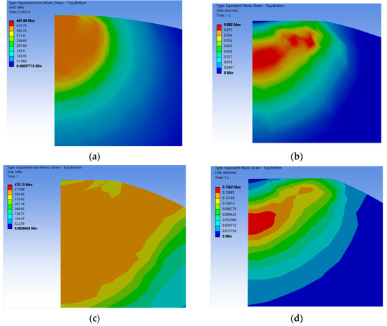 Equivalent stress and strain nephogram in plastic phase . (a) Wavy equivalent stress; (b) wavy equivalent plastic strain; (c) spherical equivalent stress; (d) spherical equivalent plastic strain.