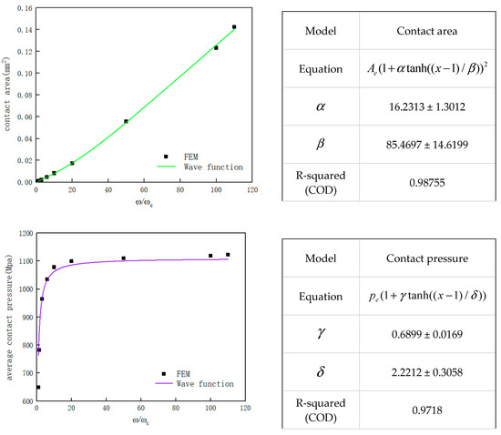 Referring to the elastic–plastic modeling research history of previous scholars, high-order polynomials have advantages in fitting the data [7]; however, oscillations and the Runge phenomenon exist on the elastic–plastic curve; therefore, this paper chooses the excessively smooth monotonicity of the low-order function for correction. Combining the descriptions of mechanical behaviors in the elastoplastic phase given by several scholars [8,9,10] and the results of finite element analyses, the expansion of the plastic zone inside the wavy asperity leads to a nonlinear growth in the contact area, and its growth rate gradually slows as the contact depth ω increases. At the same time, the trend of the contact load changes in the elastic–plastic phase is a nonlinear increase, and the function needs to satisfy the requirements of strict monotonicity and continuity at the elastic–elastoplastic and elastoplastic–plastic critical points. To summarize, this paper chooses the simple, smooth, and monotonically increasing hyperbolic tangent function as the function description of this phase, and it extends the elastic solution to the elastic–plastic deformation range by introducing the correction term . According to the correction term, the contact radius of the elastic–plastic phase is redefined as: