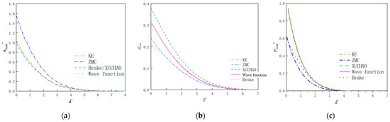 Comparison of contact characteristics of asperities with different statistical models. (a) Normalized contact area; (b) normalized average contact pressure; (c) normalized contact load.
