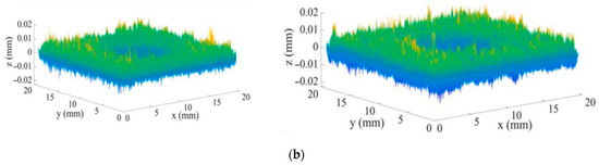 According to the above analysis of the rough surface normal contact model, the plastic flow and stress concentration phenomenon of the wavy asperity is more obvious than that of the spherical asperity, and the trend of stress–strain growth tends to flatten out with the increase in the contact depth from elastic–plastic to plastic; at the same time, from the surface topography measurement experiments of the rough surface, see Figure 9, the actual rough surface shows multi-scale periodic fluctuations, while the spherical asperity is unable to describe these asymmetric peaks and valleys due to the constant curvature; the wavy asperity can more flexibly match the power spectral density (PSD) of the measured contour by adjusting the wavelength () and amplitude (). Therefore, this paper concludes that the wavy asperity has advantages over the spherical asperity in terms of the mechanical properties of the individual models and the feedback mechanism of the entire rough surface morphology. In subsequent research, wavy asperities can be prioritized [24,25].