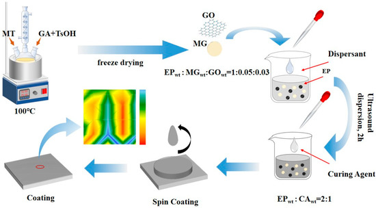 At the same time, its solvated segments extend in systems such as epoxy coatings, forming an effective steric hindrance to prevent the mutual aggregation of pigment or filler particles, thus achieving a good dispersing effect. Subsequently, the mixture was supplemented with 5 wt% MG and epoxy resin for thorough blending and stirring, followed by ultrasonication for a duration of 30 min. Finally, 50 wt% curing agent was swiftly incorporated into the mixture, followed by thorough stirring to obtain an anti-rust coating, as shown in Figure 1. The arrows in the figure represent the direction of the preparation process, graphene oxide is represented by a thin mesh symbol, MG is represented by a circle, the small black dots and yellow dots in the beaker represent EP, and the SVET plot at the end of the process represents the electrochemical morphology of the coating micro-zone.