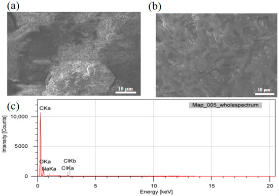 SEM morphology of Q355B steel without and with anti-rust coating: (a) SEM of Q355B steel; (b) SEM of Q355B steel with anti-rust coating; (c) EDS spectrum of the entire area in (b).