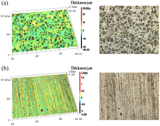 Figure 3 shows the 3D surface topography of Q355B with and without anti-rust coating obtained by LSCM. The surface of the rust layer changed from the original porous shape to a flat and uniform film morphology, and the original loose corrosion products may have reacted with the MG in the coating and were subsequently covered by the film. SEM observations suggest that the MG formulation may penetrate interparticle voids in the surface rust layers; however, verifying its distribution within the 150 μm coating requires cross-sectional analysis to resolve potential leveling effects. The coordination reaction between iron ions and MG may convert the harmful rust into a complex or chelate, which provides protective effects on the substrate and promotes the appearance of a flat film. GO further enhances the homogeneity and conductivity of the coating. Additionally, LCSM can indirectly acquire membrane thickness information through 3D imaging capabilities. The surface topography of Q355B with anti-rust coating in Figure 3b is smoother than that of Q355B without coating in Figure 3a; the thickness of surface topography was 27.056 μm and 1.836 μm, corresponding to Q355B without and with anti-rust coating, respectively, demonstrating the strong protective effect of the anti-rust coating through the significant reduction of corrosion products.